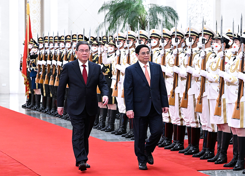 6月26日上午,国务院总理李强在北京人民大会堂同来华进行正式访问的越南总理范明政会谈。这是会谈前,李强在人民大会堂北大厅为范明政举行欢迎仪式。新华社记者 饶爱民 摄