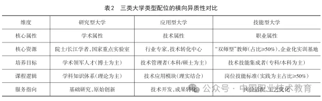 最后,社会认知的偏差进一步固化了类型错位。部分家长与学生将“技能型大学”等同于“低层次教育”,认为“学术化”才是“高质量”的象征,导致院校为“吸引生源”刻意淡化“职业属性”。例如,某技能型大学在招生宣传中,重点强调“可授予学士学位”“考研升学率”,却很少提及“实训基地”“企业合作”;个别院校甚至试图将“职业技术”字样从校名中删除,如“××职业技术大学”曾经一度拟更名为“××应用技术大学”。这种“学术化倾向”不仅使技能型大学丧失自身异质性,更导致高等教育系统的“类型趋同”——研究型、应用型、技能型大学的边界模糊,难以形成 “各安其位、各展所长”的发展格局。基于异质性理论“横向差异”逻辑,技能型大学的类型配位需与研究型、应用型大学形成清晰的“属性—资源—目标” 差异(表2),核心是职业属性不可替代。