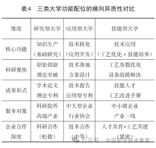 基于异质性理论“横向差异”,技能型大学的功能配位需与研究型、应用型大学形成“创新链—转化链—应用链”的协同闭环(表4),核心是产业服务的 “实用性”与“落地性”。