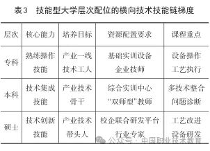 技能型大学的层次配位需突破“单一学历层次”局限,基于异质性理论 “横向差异”构建“专科—本科—硕士”的技术技能链梯度(表3),每个层次的核心能力与资源配置形成闭环。