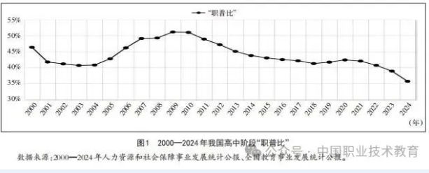 基于2000—2024年的纵向数据,我国“职普比”的演进轨迹呈现出鲜明的阶段性特征,其结构性拐点与波动趋势为审视与评估相关政策提供了关键实证镜鉴(图1)。