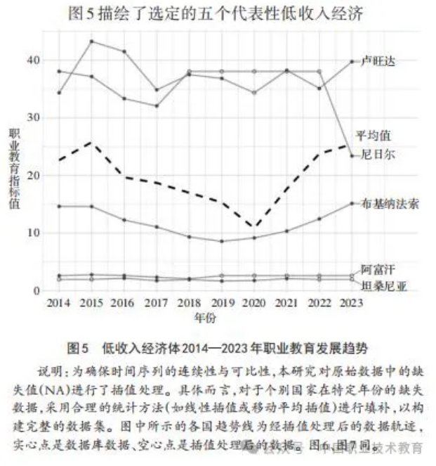 图5描绘了选定的五个代表性低收入经济体2014—2023年的职业教育发展动态。图中的水平虚线代表了本研究所涵盖的所有低收入经济体样本在2014—2023年的职业教育指标算术平均值。