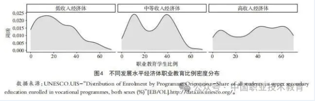 中等收入经济体的密度曲线为双峰——结构分化,路径抉择,身处转型。中等收入经济体的分布曲线呈现明显的双峰形态,这与高收入组(单峰、右偏)和低收入组(单峰、左偏)形成鲜明对比。这表明中等收入经济体并非一个同质化的群体,其内部在职业教育发展路径上存在着深刻的结构性分化,也揭示该群体内部存在的两个世界或两种发展模式。具体而言,双峰结构揭示了两个潜在的子群体。第一个峰值(左侧,约10%~15%区间)的国家可能仍处于以低技能劳动密集型产业为主导的发展阶段,其职业教育体系尚不完善,发展模式更接近于低收入经济体,职业教育规模相对有限。第二个峰值(右侧,约35%~40%区间)的国家可能正处在工业化深化或产业升级的关键时期,对技能型人才需求迫切,因此大力发展职业教育体系,其发展水平已向高收入经济体看齐。这表明,不能将中等收入经济体视为一个整体来借鉴职业教育政策,须识别自身在该双峰分布中所处的位置,以此精准对标。