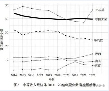 图6揭示了2014—2023年中等收入经济体职业教育比例的复杂演进轨迹。该群体整体呈现显著的分流演进与模式竞争特征,其“职普比”格局远非单一模式所能概括。