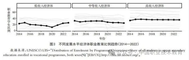 图3描绘了2014—2022年三类经济体职业教育学生比例的动态演变轨迹。从整体趋势来看,不同收入组别呈现出差异化的发展路径,反映出经济发展阶段与职业教育政策取向之间的内在关联。