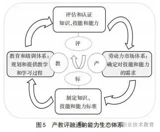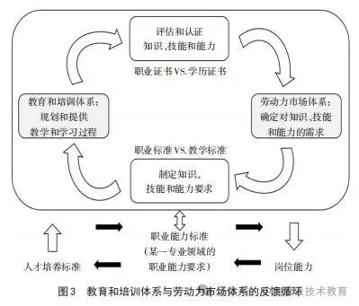 从国际经验来看,由政府/管理部门主导建设的,反映劳动力市场、行业社会组织、教育和培训机构共同诉求的职业能力标准,是VET与劳动力市场反馈机制的关键要素,在整个反馈机制中扮演着“制定知识、技能和能力要求”以及“评估和认证知识、技能和能力”的双重角色,如同桥梁一般连接着“产”与“教”两端(图3)。