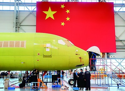 技术人员在中国商飞上海飞机制造有限公司的生产车间内作业。新华社发