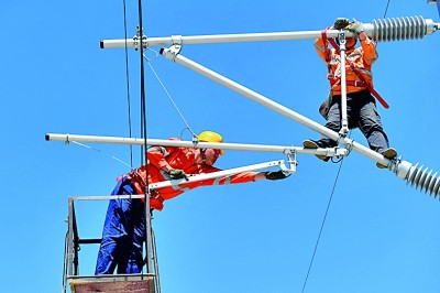 技术人员在商合杭高铁浙江湖州段调整接触网导线。新华社发