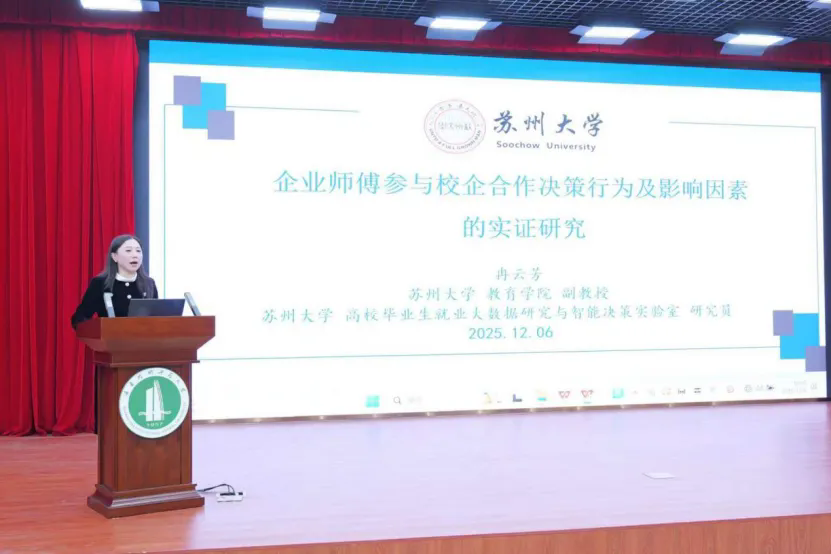 苏州大学副教授冉云芳基于实证调查,分享了《企业师傅参与校企合作决策行为及影响因素的实证研究》。她分析了企业师傅在校企合作决策中的实际角色与影响力,提出了政策激励、企业制度、个人能力、校企关系等多重影响因素,为深化校企合作、激发企业主体活力提供了微观实践与改进启示。