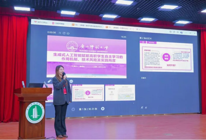 广西师范大学副研究员唐瑗彬作《生成式人工智能赋能高职学生自主学习的作用机制、技术风险及实践向度》的报告。
