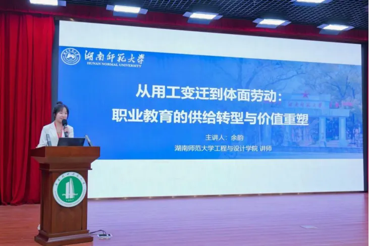 湖南师范大学讲师余韵作了《从用工变迁到体面劳动:职业教育的供给转型与价值重塑》的报告。
