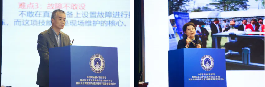 武汉铁路职业技术学院副校长彭开勤、西安铁路职业技术学院副校长熊奇、重庆交通职业学院轨道交通学院副院长李泽、浙江机电职业技术大学赵文涛博士、南京铁道职业技术学院“2025年全国最美教师”称号获得者薄宜勇、天津铁道职业技术学院副校长李志慧等6位院校代表,结合各院校实训设备自主研发成果案例分别作经验分享。
